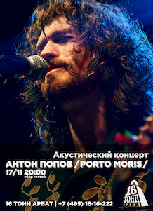 Антон Попов— лидер группы Porto Moris представит специальную акустическую программу. В камерной атмосфере прозвучат как хорошо знакомые слушателям хиты, так и авторские композиции Антона.