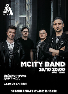Приглашаем вас на незабываемый концерт MCity Band! Эти талантливые музыканты привнесут в ваши любимые хиты мировой и отечественной музыки свой уникальный стиль и харизму. Они смело смешивают стили, от мощных треков Limp Bizkit и Metallica до энергичных мелодий Зверей и Руки Вверх!