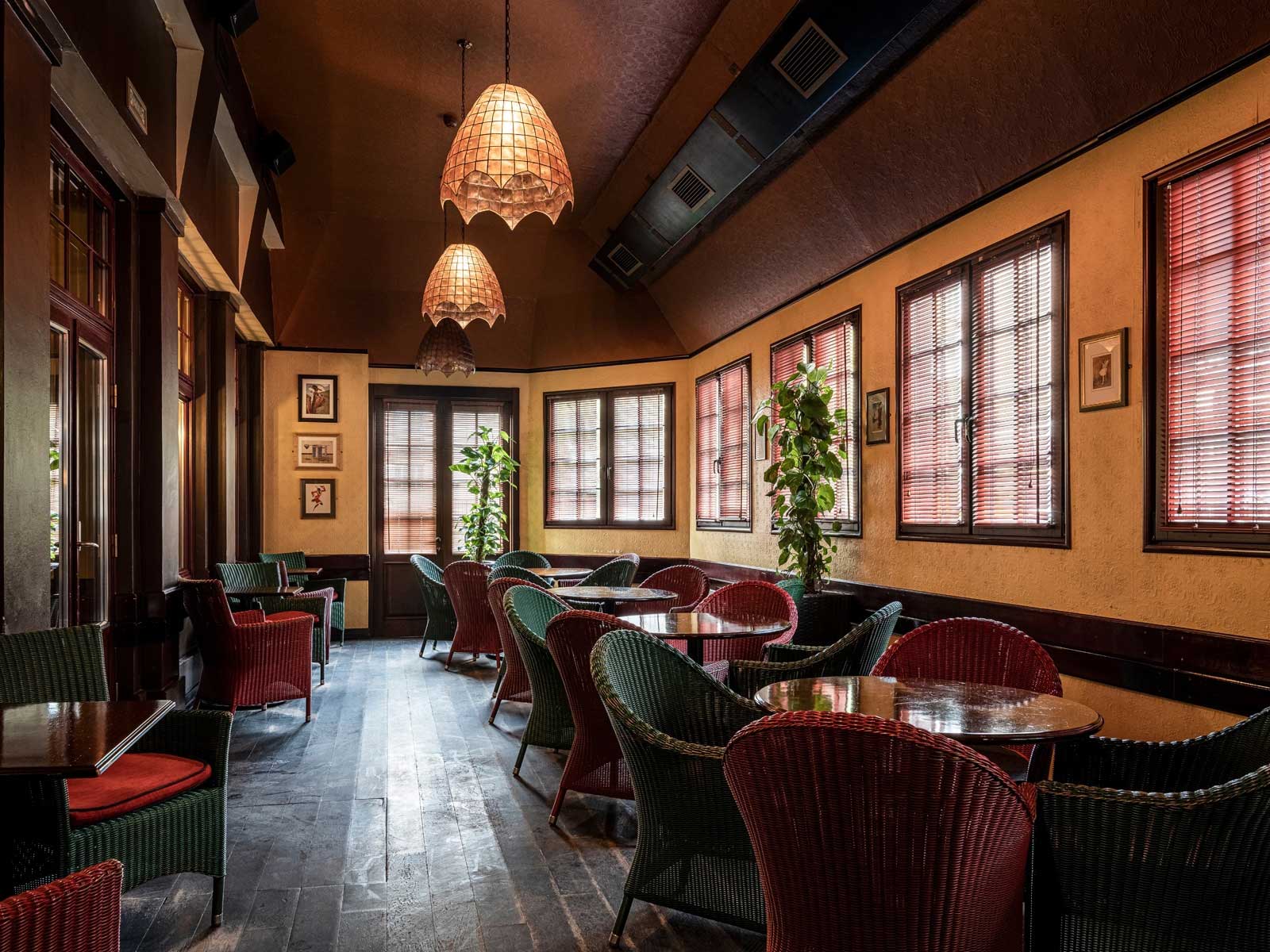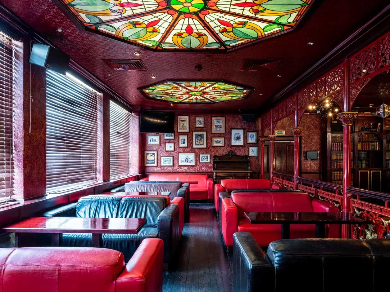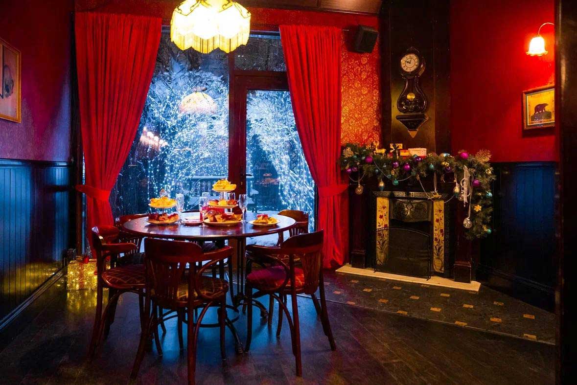 · «Алый зал» — самое популярное пространство «Тонн» на первом этаже. Узнаваемый ало-золотой интерьер, старинный камин, балкон с балюстрадой и выход в маленький дворик для тех, кто мечтает загадать желание, глядя в зимнее небо.